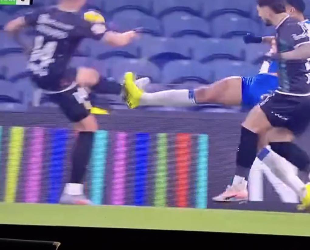 Entrada de pitões do Alberto Costa no jogador do Estrela da Amadora e o árbitro não dá amarelo ao Alberto e ainda assinala penalti.